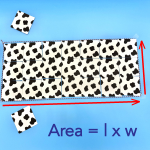 Students build fences around rectangular cow-patterned “fields” and discover that area and perimeter are different concepts.